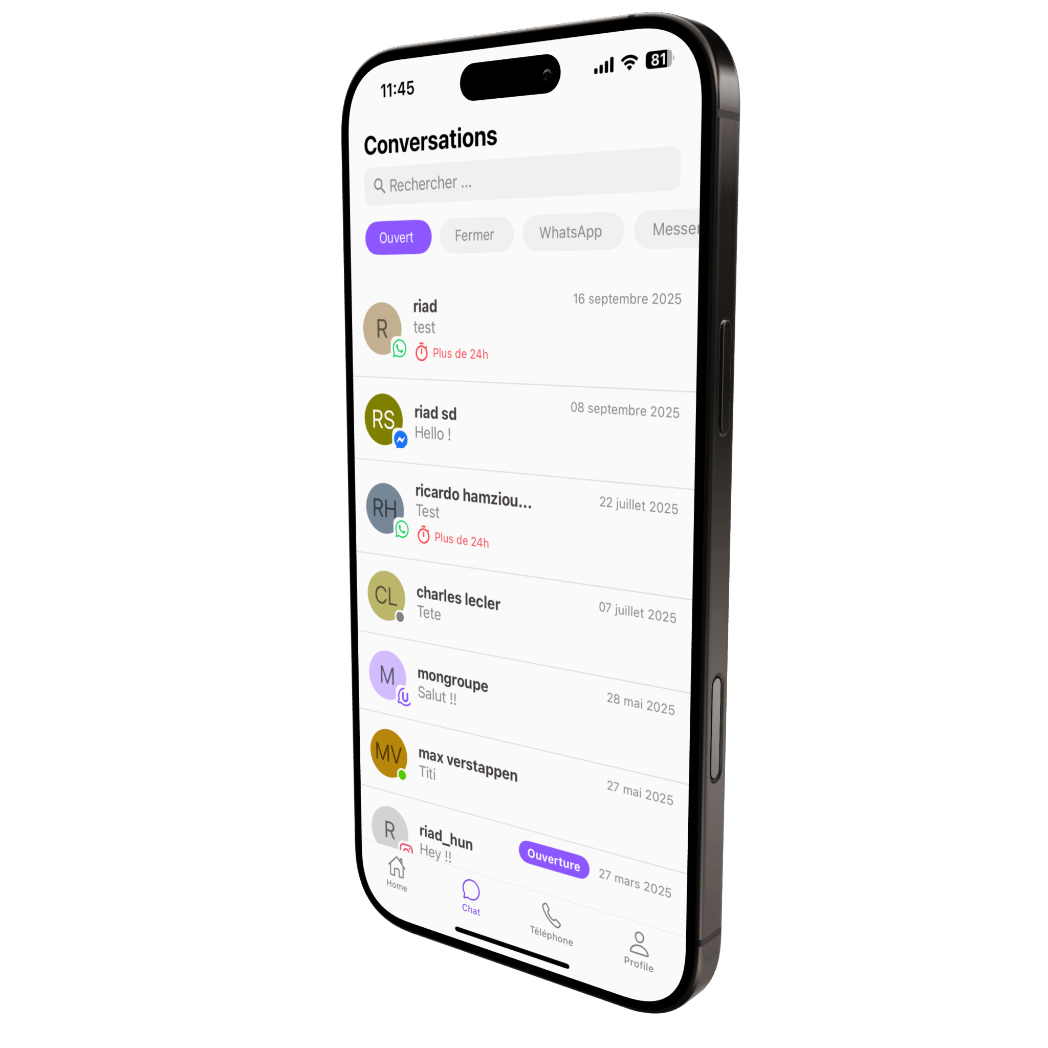 Intégrez le numéro de téléphone, l'adresse e-mail, ainsi que les comptes Messenger, Instagram, et WhatsApp en un seul contact, tout en identifiant le canal utilisé par votre client.